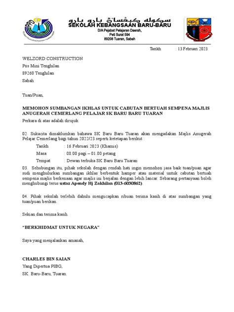 - Nyatakan tujuan surat tersebut, yaitu meminta sumbangan untuk program tertentu